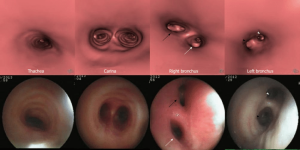 تومور، علائم عفونت، موکوس و ترشحات غلیظ راه هوایی، محل دقیق خونریزی، انسداد راههای هوایی مثلا با جسم خارجی یا موکوس، ترشحات سفید غلیظ که در بیماریهای خاصی مانند PAP دیده میشود، اجسام خارجی گیر کرده در راه هوایی و آنومالیهای مادرزادی راههای هوایی مثل اشکال در تشکیل یا دوشاخه شدن برونشها و …